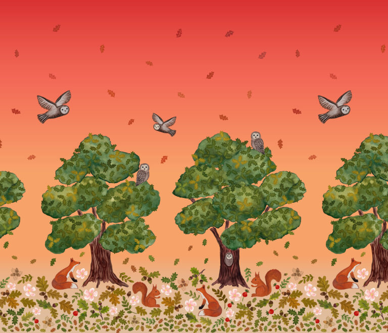 Our ‘Old Quercus’ fabric collection includes some of the natural diversity that lives in harmony with the oak trees. Owls, foxes, squirrels, and acorns all feature in the designs with a fabulous double edge border panel. The colours mirror the changing hues of Autumn, a season where oaks leaves change, and evoke the nostalgic ambiance of an Autumnal woodland walk.