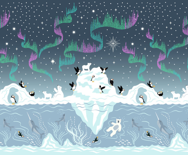 It’s our imagined, magical northern world where puffins spend their winters alongside polar bears and narwhals, all beneath the North Star’s glow, while the northern lights swirl and dance above.