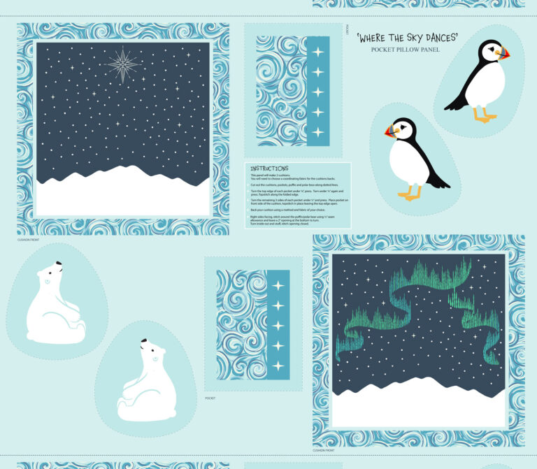 The collection includes a double edge border and an adorable pillow panel with pockets to pop in your puffin.